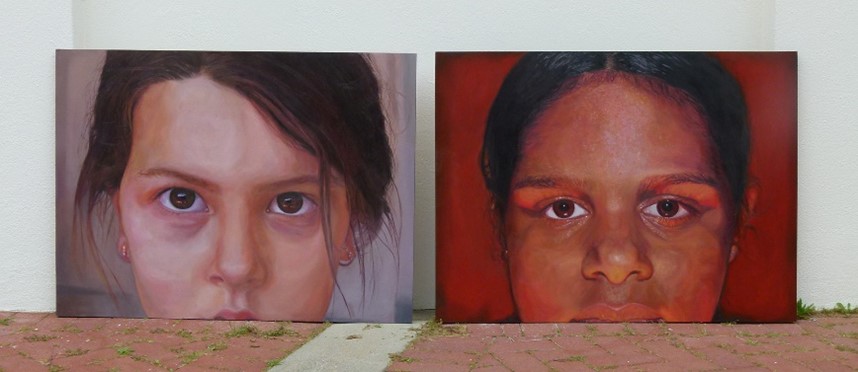 This has been photographed in the shade (even light) and shows both paintings together, in their entirety.
